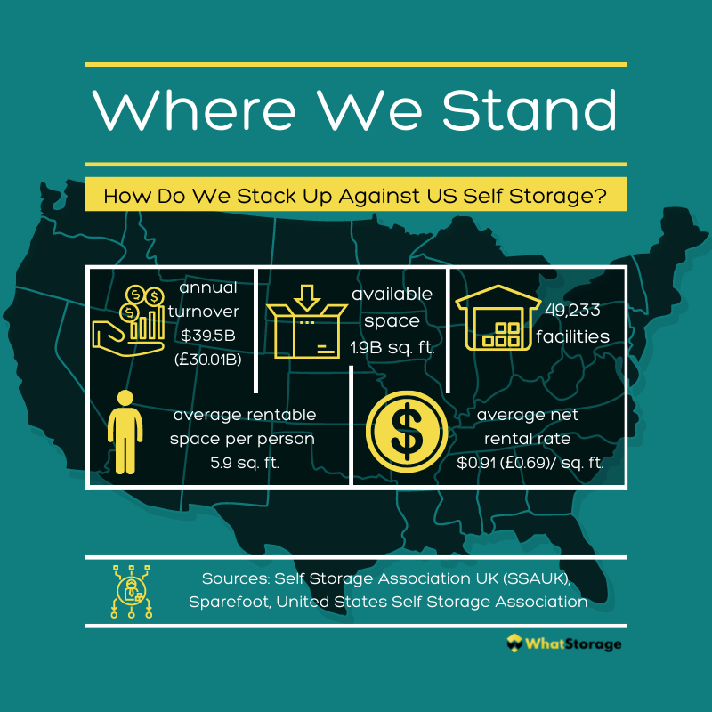 To recap, here is a look at all the figures surrounding the United States Self Storage Industry:- Annual Turnover – $39.5B (£30.01B)